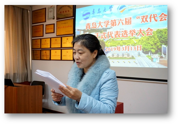 经与会代表无记名投票,差额选举校党委常委、副校长肖江南,学院党委书记王传永,党委副书记、院长卞建华,党委副书记王海青、副院长布占廷、娄永强,英语系主任陈黎、德语系主任綦甲福和法语系主任段丽君等9名同志为出席第六届“双代会”正式代表。
