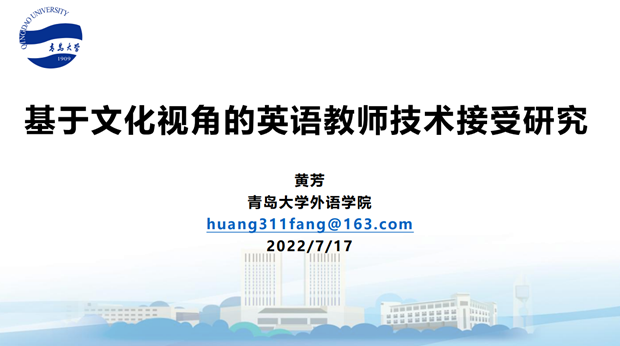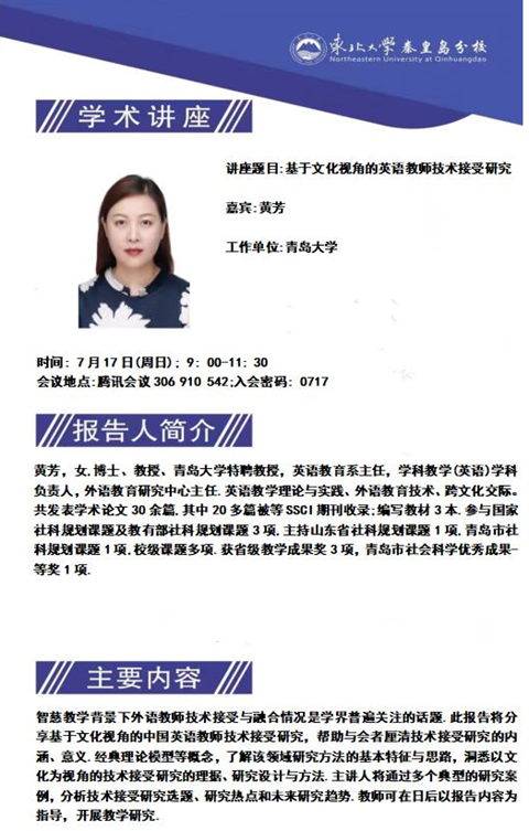 2022年7月17日上午,黄芳教授应邀为东北大学秦皇岛分校外国语言文化学院的师生做了题为《基于文化视角的英语教师技术接受研究》的学术讲座。此次讲座由惠良虹教授主持,以腾讯会议的方式进行,吸引了东北大学秦皇岛分校及其他院校的百余名师生参加。东北大学秦皇岛分校外国语言文化学院赵玉容院长及黑料