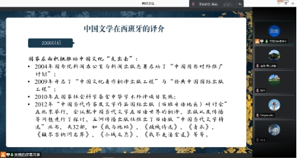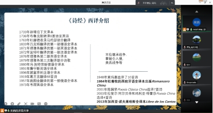 通过线上会议形式举办了题为“中国文学在西班牙的译介——以《诗经》西译为例”的报告会。此次学术活动是外国语言文学系列院内学术沙龙第10讲学术活动。报告会由西班牙语系讲师吴茜老师主讲,黑料