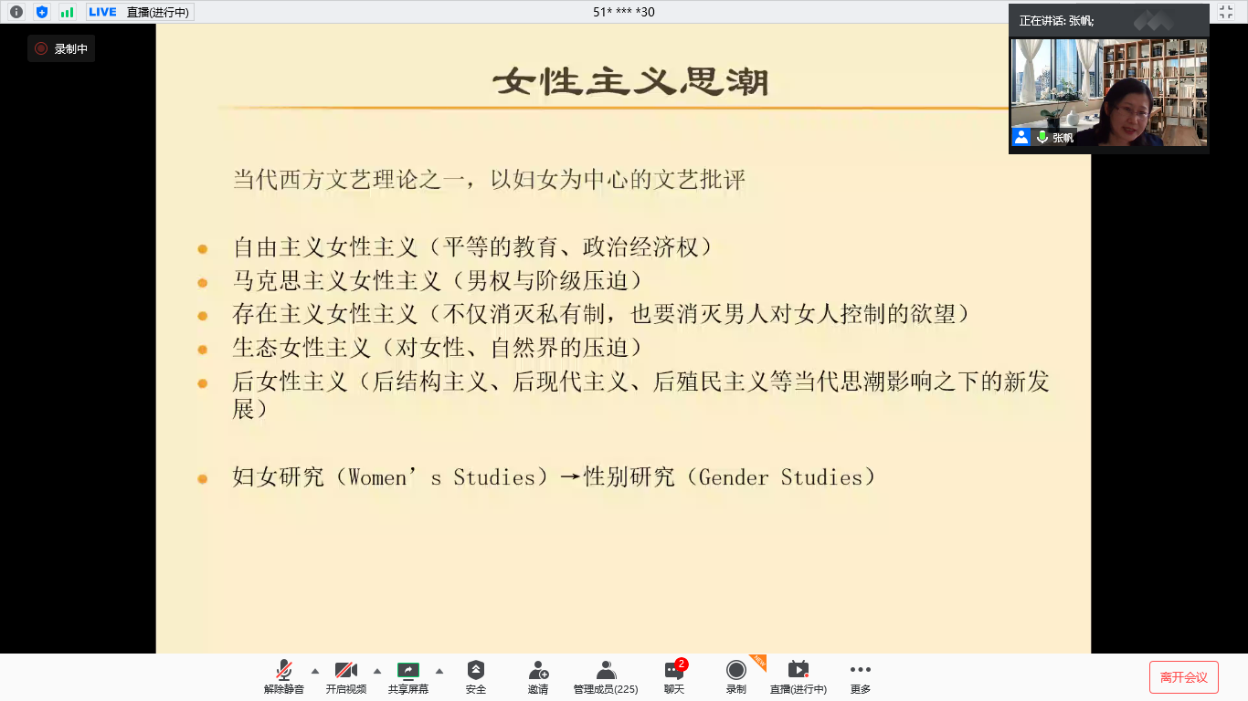 邀请,我校德语系94级校友、上海外国语大学博士生导师张帆教授通过腾讯会议为我们带来了“德语女性主义语言学导论”的学术讲座。本次讲座由德语系主任綦甲福教授主持,德语系师生、校友以及来自国内外高校的师生共230余名听众聆听了讲座。