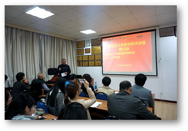 、数据科学与软件工程学院、中译语通公司等单位就英语大数据本科人才培养以及科研合作等问题进行座谈交流,座谈会后宋柔教授做题为《大数据与语言信息处理》的学术报告。院长卞建华、中译语通公司副总经理梁镇爽、技术总监黄振,数据科学与软件工程学院孙更新教授以及相关专业教师、硕士研究生、英语大数据专业本科生聆听了讲座。英语系邢富坤教授主持。