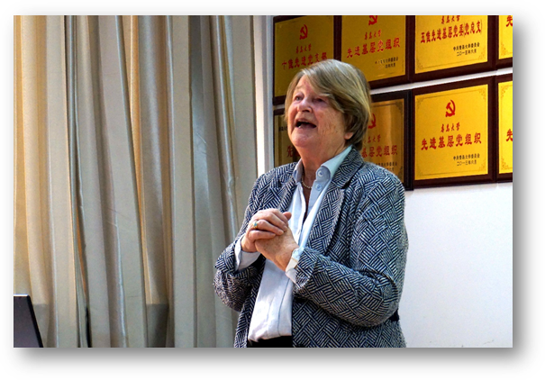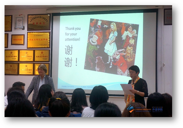 诺德教授以《爱丽丝梦游仙境》为例,介绍了小说文本中两类文化标记词“Behaviors”和“Conditions”。通过对文本片段的德语、法语、西班牙语、巴西语、葡萄牙语、意大利语、汉语译本的对比,分别介绍了各类文化标记词对文本世界和读者世界之间文化距离的影响以及目的论视角下的翻译策略。所选片段典型、易懂,讲授风格风趣、幽默,现场互动活跃。最后,诺德教授总结归纳了译者应对文学翻译中文化标记词的三类翻译策略:“reproduce”, “Adapt”, “neutralize”。