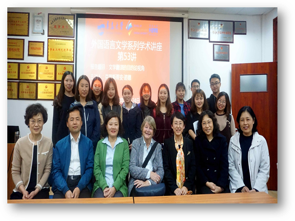 在博文楼312会议室举行“外国语言文学系列学术讲座”第53讲。国际翻译界知名学者、德国功能翻译学派代表人克里斯蒂安·诺德教授,应邀为外院师生做了“文学翻译得目的论视角”的专题学术讲座。院长卞建华主持讲座,学院部分老师及研究生参加此次讲座。
