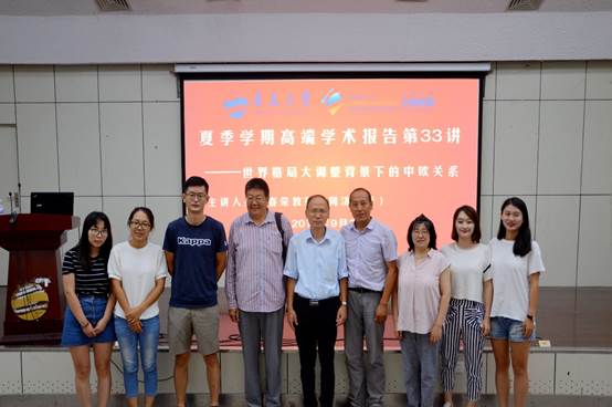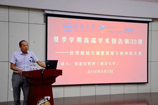 在图书馆报告厅举行夏季学期高端学术讲座第33讲。同济大学外国语学院郑春荣教授应邀作“世界格局大调整背景下的中德、中欧关系”的高端学术讲座。德语系主任綦甲福教授主持,校外内260余人聆听了讲座。