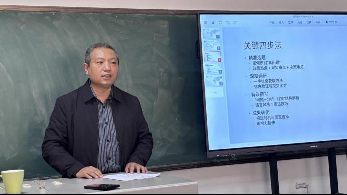 魏建平教授结合自身丰富的智库研究与政策建言经验展开讲解。他首先从“破题——什么是好的智库报告”入手,强调智库报告的本质是“决策者的行动参考书”,其核心使命在于服务决策、影响政策、推动改变。他指出,智库思维与学术思维存在显著区别:学术研究追求“为什么”,是“挖深井”,追求深度,而智库报告追求“怎么办”,是“架桥梁”,追求实效。魏教授系统阐述了撰写高质量智库报告的“关键四步法”:一是精准选题,需紧密结合政策热点、现实痛点与决策难点;二是深度调研,强调一手信息获取与交叉验证的重要性;三是有效撰写,推荐采用“问题—分析—对策”等结构,语言风格应简明扼要,善用数据与案例支撑;四是成果转化,注重报送时机与渠道选择。概而言之,一份好的智库报告应具备“三有”:有靶心、有实策、有回响。