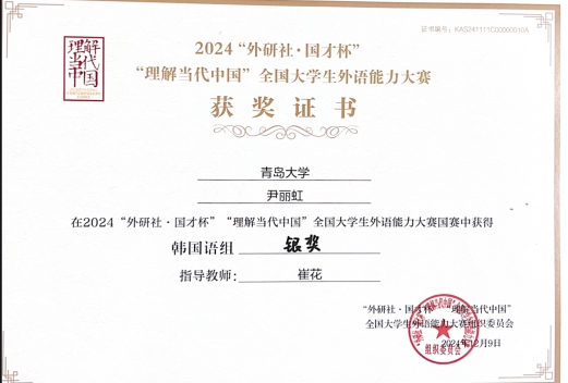 2024级朝鲜语口译尹丽虹同学荣获全国总决赛多语种韩国语组银奖。