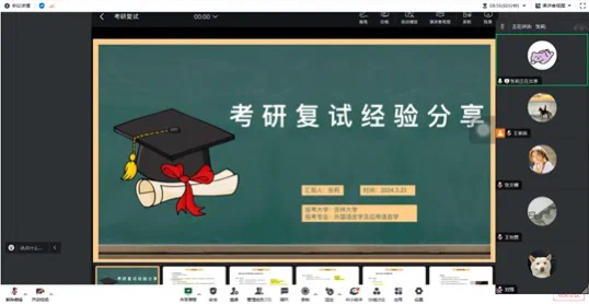 他们以自己的亲身经历为例,分享了在复试准备过程中的心得体会。吉林大学外国语言学及应用语言学专业的张莉从复试的自我介绍、专业课问答、专业相关谈论三方面展开分享,强调复试考验学生的综合素质、能力测试和外语听说能力测试,要吃透专业课重点术语和理论,练习外语流利表达。