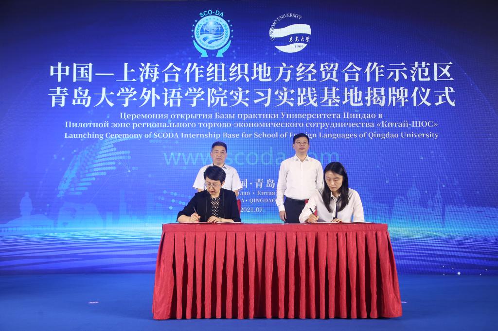 院长卞建华与上合示范区管委商旅文化部部长夏鹏共同签署了共建实习实践基地协议,杜方波与孟庆胜共同为黑料