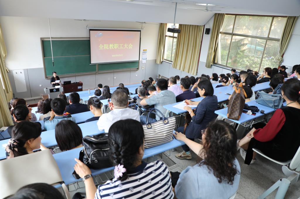 在博文楼217教室召开全院教职工大会传达学习学校会议精神并部署新学期工作。会议由院长助理曹杉主持,全院教职工参加了会议。