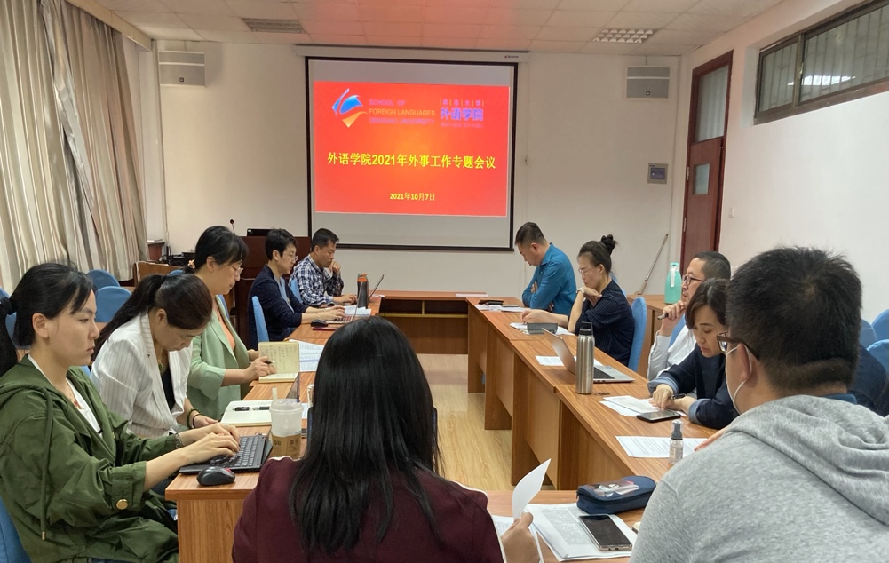 在博文楼312举行2021年外事工作专题会议。院长卞建华、副书记王海青、院长助理曹杉以及各系负责外事的主任或副主任出席会议,会议由副院长宫英瑞主持。