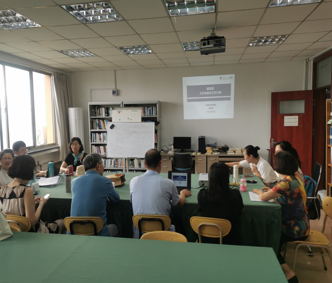 德语系副主任刘沁卉老师就2021版本科人才培养方案修订工作进行了总结,对全系老师在该项工作中的积极配合表示感谢。研究生教研室主任刘惠宇老师、基础阶段教研室主任程茜老师、专业阶段教研室主任黄怡容老师也分别对研究生培养方案修订工作及上学期各自分管工作进行了简短总结。