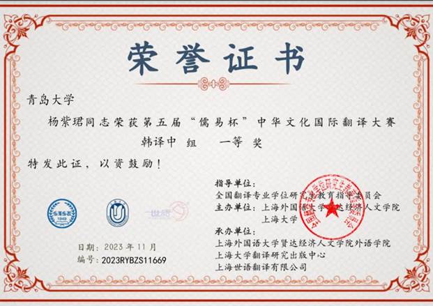 学生能够获得各项佳绩,充分体现了学院在翻译人才培养方面的实力和水平。同时,此类比赛让同学们更加深入了解中华文化的博大精深,也提升了自身的实践能力和翻译水平,在中华文化向世界传播过程中贡献自己的力量。