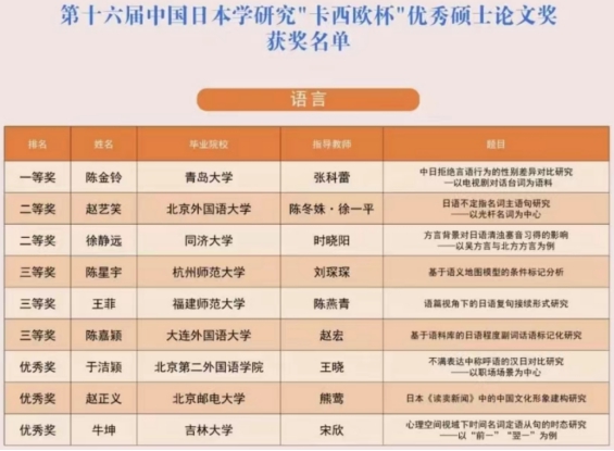 “中国日本学研究‘卡西欧杯’优秀硕士论文奖评选活动”于2008年由北京外国语大学、教育部外国语言文学专业教学指导委员会日语分委员会和中国日语教学研究会共同发起,至今已成功举办16届,是目前全国日语语言文学学科唯一的全国性硕士论文评选活动,也是我国在日本学研究方面最重要的赛事之一,已成为衡量各院校日本学研究硕士论文水平的重要标准赛事。本届评选活动共收到全国54所高校推荐的102篇参赛论文。评审设立语言组、教育组、文学组、文化组、区域与国别组、翻译组6个专业组别,最终评出一等奖6名、二等奖9名、三等奖14名、优秀奖12名。其他各组别获得一等奖的同学分别来自北京外国语大学、南开大学、华东师范大学和北京第二外国语学院。在此前的第十三届和第十五届比赛中,黑料