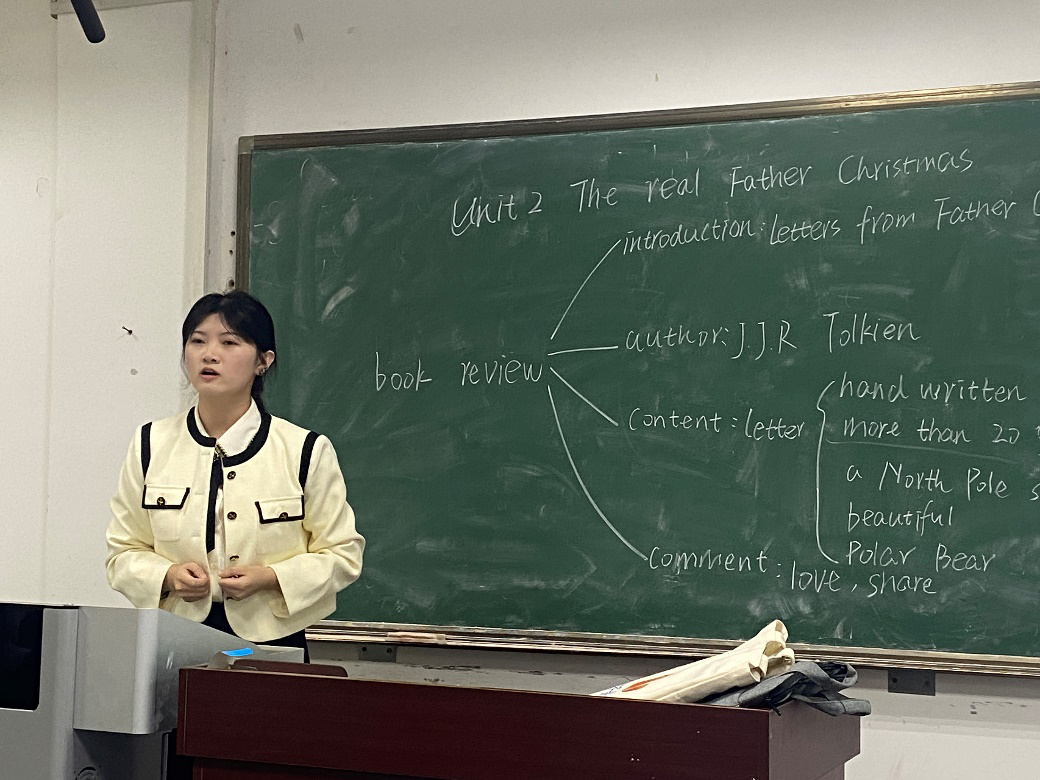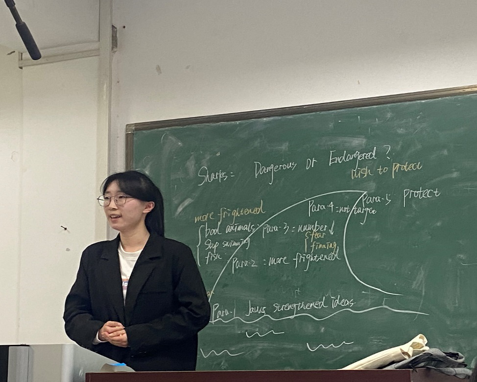 在讲座过程中,英语教育系2021级董蓉蓉和崔祉祺同学分别为大家带来高中英语教材“Sharks: Dangerous or Endangered?”以及“The Real Father Christmas”语篇的讲课展示。