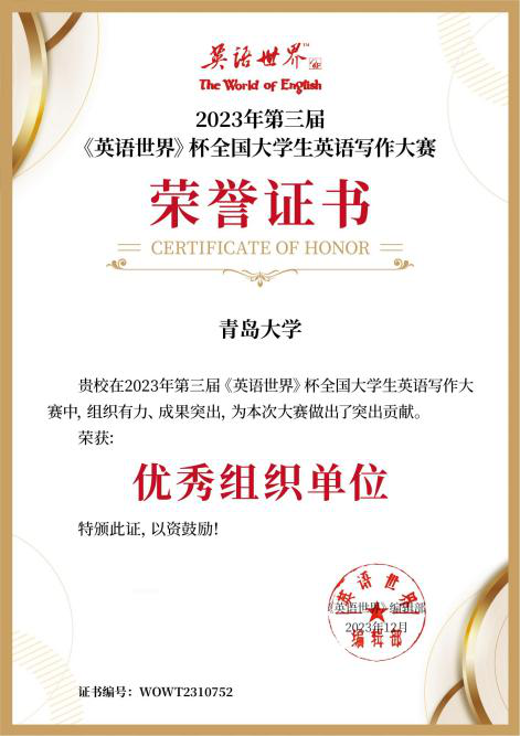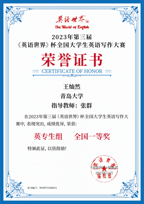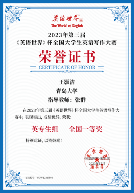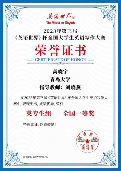 学生参加了第三届《英语世界》杯全国大学生英语写作大赛并喜获佳绩。英语系22级王灿然、王颢洁,23级高晓宇三名同学荣获全国一等奖,艾江宇等六名同学荣获全国二等奖,徐梦欣等六名同学荣获全国三等奖,刘雨彤等四名同学荣获优秀奖,黑料