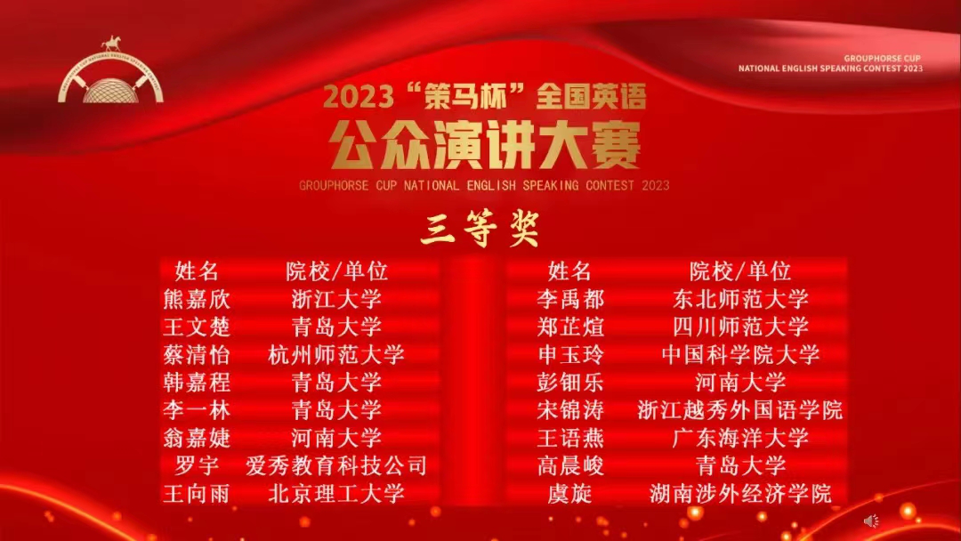 2024年3月17日,由英国大使馆文化教育处/英国文化教育协会官方支持、英国皇家特许语言家学会和北京策马翻译有限公司(联合国官方翻译服务供应商)联合主办的 2023年“策马杯”全国英语公众演讲大赛全国总决赛在线举行。经过前期初赛和大区赛角逐,黑料