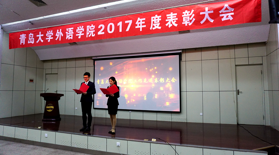 在图书馆报告厅隆重举行2017年度表彰大会。德语系、日语系、学工办和党政办4个工作先进集体,牟晓燕等20位学校和学院综合考核优秀人员,陈骏飞等19位年度工作突出个人受到表彰。