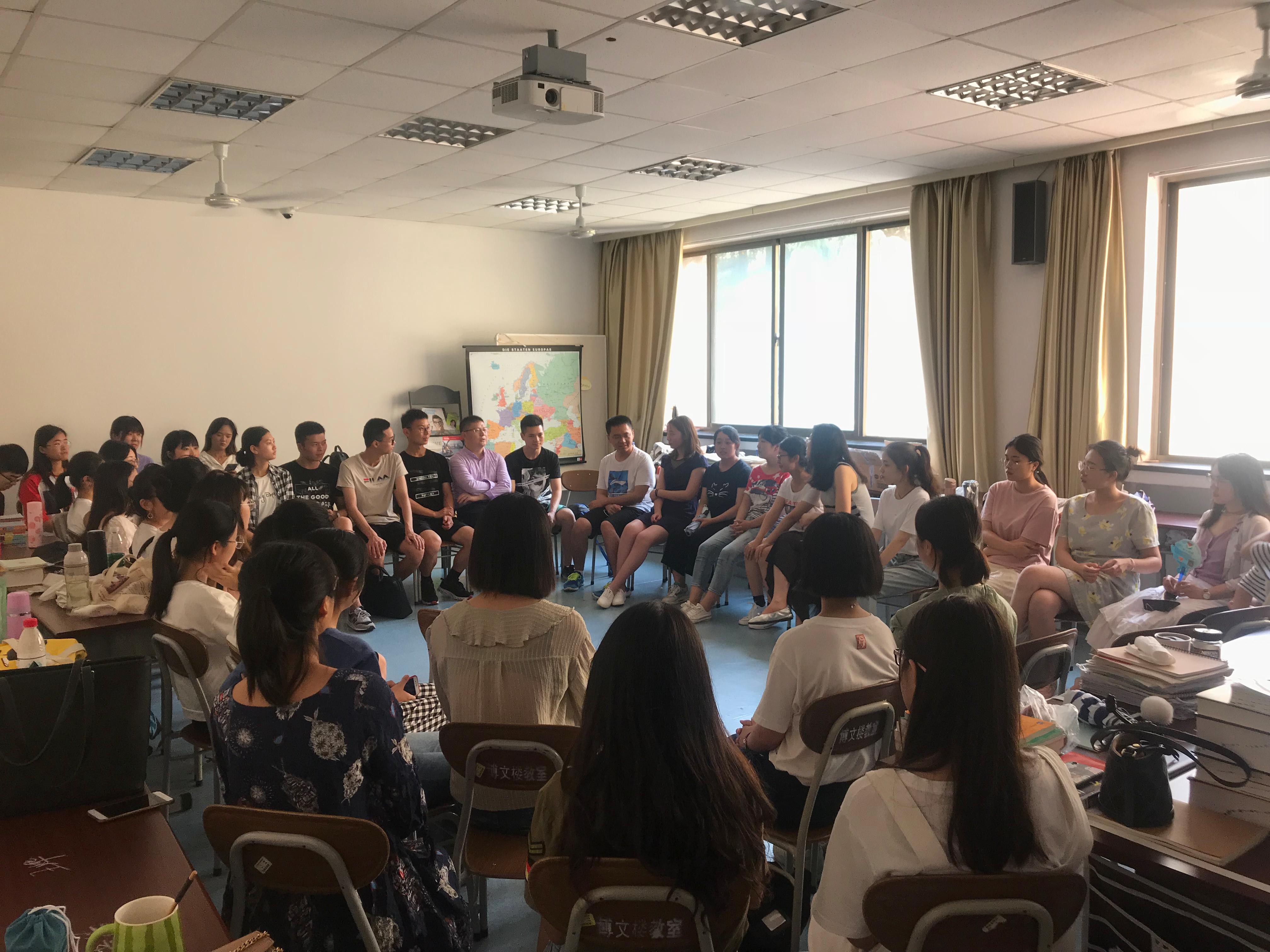 17级德语专业师生50余人与来自战略支援部队信息工程大学(洛阳校区)的9名师生举行专业交流座谈会。座谈会由我系程茜老师主持,同学们从专业学习、未来规划、课余生活等方面进行了分享和讨论,老师们根据双方存在的异同点进行了比较和分析。