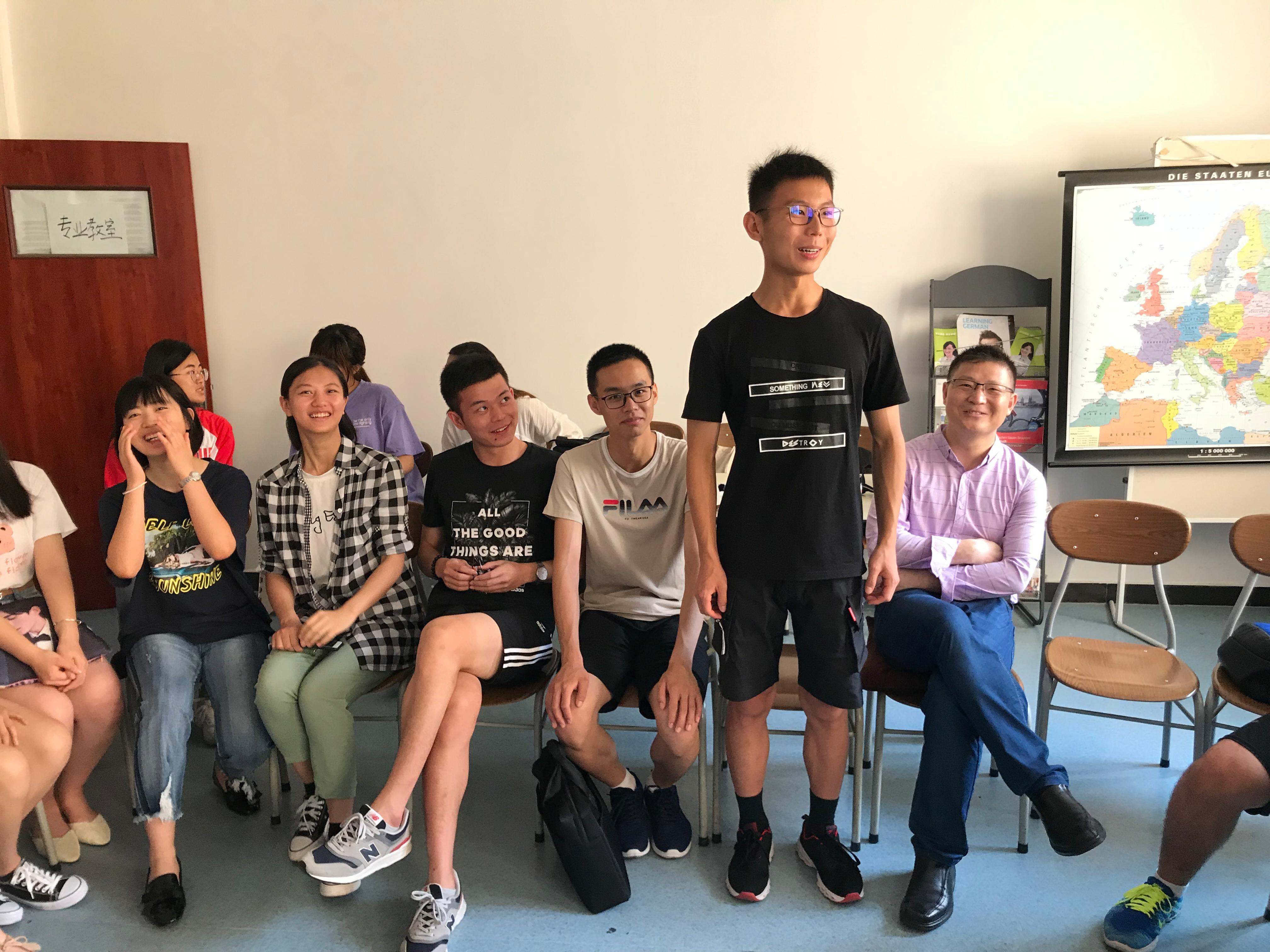 座谈会开始,双方先就彼此的专业概况以及校园日常生活展开了讨论。信息工程大学带队的陆巍老师介绍了该校德语专业的发展历史、招生制度等,该校17级德语专业班长张晨风对德语专业课程以及军事化校园生活进行了详细介绍。与普通大学生不同,作为军校生,他们每天除了基本的专业课学习,还要进行与军事相关的课程学习以及高强度的体能训练。