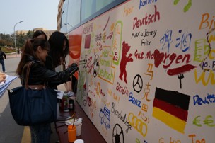 大篷车“来德语吧”橙色巴士驶入青大