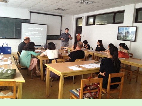黑料 中德中心、德语系与德意志学术交流中心合作,于6月29日在黑料 310教室举办“青岛市德语教师交际型教学法培训与研讨班”,15名来自青岛科技大学与黑料 的德语教师参加了该培训。培训由德意志学术交流中心教师培训专家罗天海博士(Dr. Mark Rothensee)主讲,就电影短片在初级德语教学中的应用进行了深入探讨。培训结束,大家都感觉意犹未尽,深感需要学习的地方还有很多。