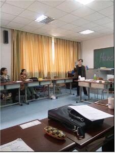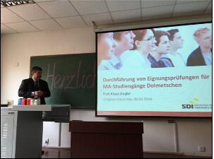 与此同时,在隔壁309教室,另一位来自慕尼黑应用语言大学的老师Klaus Ziegler教授正为德语系老师介绍“ 慕尼黑应用语言大学会议翻译硕士课程入学考试”。报告长达三个半小时,Ziegler教授除介绍考试内容之外,还与德语系老师们就今后如何拓展双方合作,进行了深入交流,并达成初步构想。