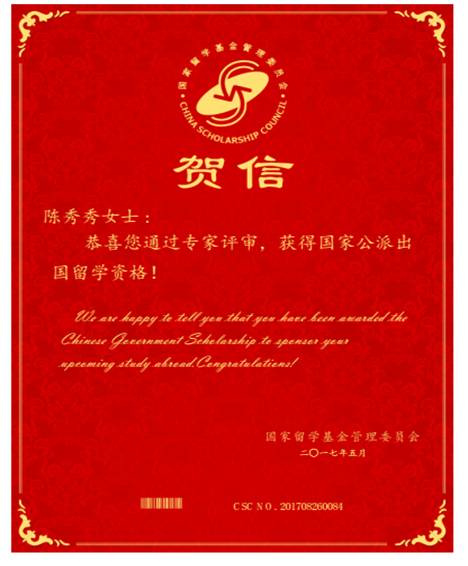国家留学基金委员会给陈秀秀同学发来的贺信