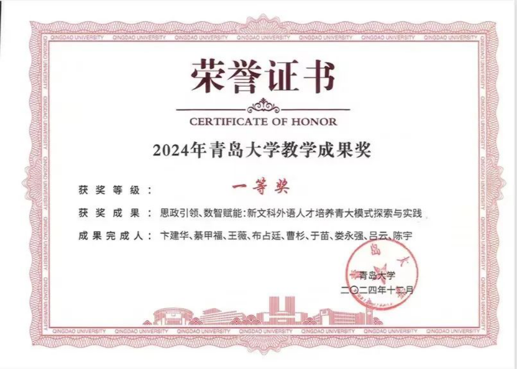 教学成果奖一等奖、二等奖,1人获评“山东省高等学校教学名师”,首部数字教材《英语文学导论》出版上架。教学比赛再创佳绩,4人次在省级、校级教师教学比赛中获奖。2024届本科毕业生国内外深造率达41%,毕业生就业率达89%,英语专业2024届英语(语言大数据)创新实验班毕业生继续深造率达71.4%,人才培养成效显著。本科生183人次获得校级以上竞赛奖励,研究生发表高水平论文7篇,竞赛获奖56人次。