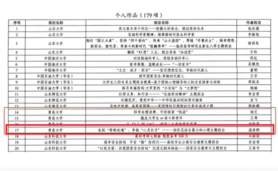辅导员温凌鹤、李聪聪荣获辅导员工作优秀案例三等奖,温凌鹤凭借《告别“带刺玫瑰”,争做“心灵补手”——一场防范语言暴力的心理主题班会》获评山东省辅导员主题班会优秀教案个人项目。