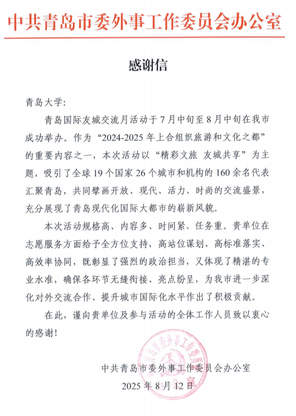 将继续努力为学生搭建更好平台,鼓励学生们积极参与各类国际交流活动,培养更多具有国际视野和专业素养的优秀人才,为青岛的国际化进程和中外友好交流事业持续贡献力量。