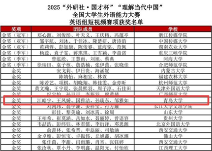 2022级英语语言文学专业研究生王凤娇与文学与新闻传播学院广播电视编导专业、汉语言文学(师范类)专业学生组成的跨学科团队共同创作的短视频作品《青岛十二里》荣获金奖。