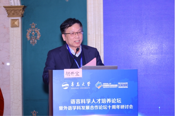 语言数据科学发展特色以及学校区域国别研究领域建设发展情况,希望本次研讨会聚焦国家数智化发展战略,为推动外语学科建设、人才培养模式创新、区域国别研究创新发展做出贡献。中国英汉语比较研究会外语学科发展研究专业委员会会长、上海外国语大学胡开宝教授在致辞中回顾了外语学科发展合作论坛(现更名为中国英汉语比较研究会外语学科发展研究专业委员会)十年发展成果,分析了当前外语学科发展面临的时代机遇与挑战,希望通过本次会议凝聚新共识、探索新路径,共同推动外语学科高质量发展。