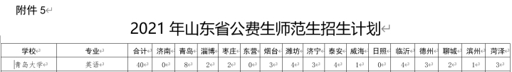 英语(师范类)专业在全省招收公费师范生40人,其中青岛地区8个,烟台3个,潍坊4个。详见: